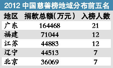 数据显示,广东、福建、江苏、辽宁、北京是入榜人数最多的5个地区,其上榜人数占到总数的59%,捐款总额占总捐款额的75%,是主力捐款地区。其中,广东有21名富豪入榜,捐款总额为16.4亿元。