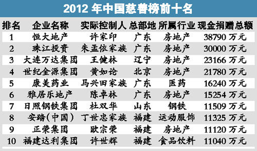榜单显示,2011年捐赠过亿元的企业家达13位。在前20名中,主要从事房地产的企业达到10家,占到一半。福布斯表示,目前,民政部尚未发布“2011年民政事业发展统计报告”,但根据其发布的2011年1~4季度全国民政事业统计累加,2011年的社会捐款总数为145.2亿元,仅为2010年的37%。