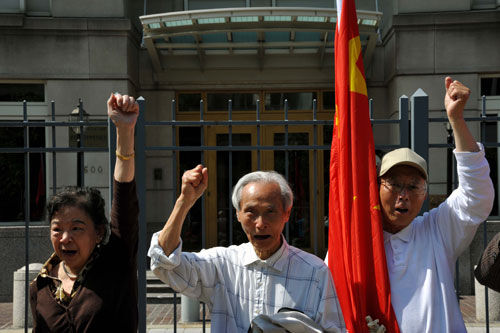 人民网华盛顿5月13日电 (记者 温宪)美国华人5月13日上午在菲律宾驻美国大使馆前举行示威活动,宣示坚决支持中国维护黄岩岛主权,严正警告菲律宾侵权蛮行。