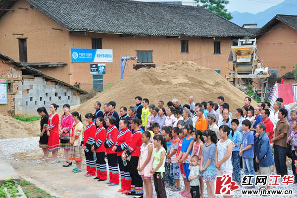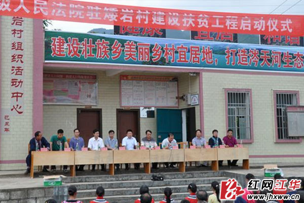 10时18分,村道硬化工程启动仪式正式开始,省高院、县人大、县政协、县人民法院、县交通局、县扶贫办和清塘壮乡的领导在主席台就坐。矮岩村刘支书首先介绍了村里的基本情况,县委常委、省高院驻江华建设扶贫工作组组长邵龙江发表了热情洋溢的动员。在他的讲话中,扶贫组将利用两年时间,广泛联系省、市、县各单位部门,从三个方面对矮岩村进行建设扶贫,为把矮岩建设成为“宜居、健康、和谐”的新型农村。当他一次一次用本地口音说出“矮岩”的时候,台下的村民无不爆发出热烈的掌声。最后,县人大常委会主任陈槐权宣布工程正式动工,将会场气氛推向了高潮。