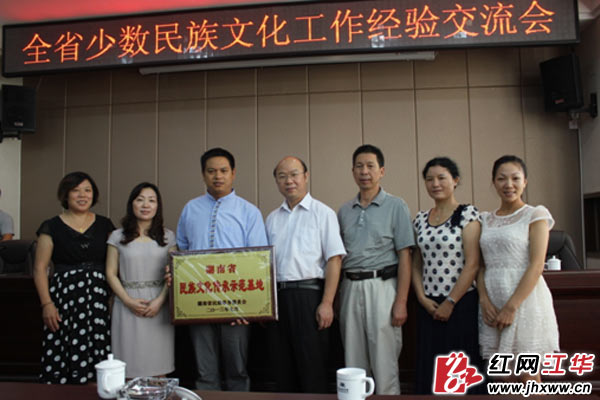 江华新闻网讯(通讯员 彭继文 赵娟)7月30日上午,在湘西吉首市召开的全省少数民族文化工作会上,沱江镇一小被评选为“湖南省民族文化传承示范基地”。此次评选是分别通过各地申报、实地调研、专家评审等方式产生,共评选出了七个“示范基地”,沱江镇一小是全省唯一一所获此殊荣的学校。会上,一小校长彭继文接受了省民委领导的授牌并就学校的“瑶文化进校园”工作情况作了精彩的典型发言,得到了与会领导和嘉宾的高度赞扬。
